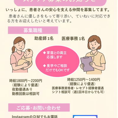 定期診断をはじめ、マタニティなどの教室、入院、出産、そして産後のケアまで、経験ゆたかな医師と看護師、各種専門スタッフによりトータルにサポートしていきます。